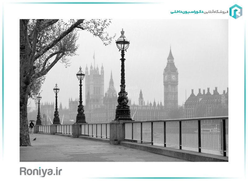پوستر دیواری سه بعدی لندن خاکستری نمایی مه آلود و پاییزی از پیاده راه های رویایی لندن