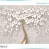 پوستر دیواری شکوفه سفید طرحی سه بعدی با ترکیبی از رنگ های سفید و طلایی و طراحی چشم نواز و آرامش بخش. چاپ بر روی بهترین کاغذ خام با رزولوشن بالا