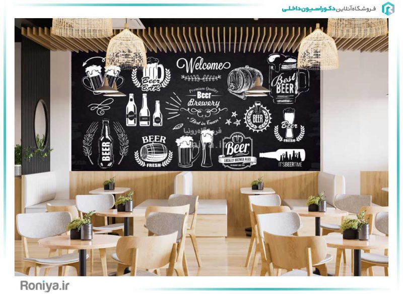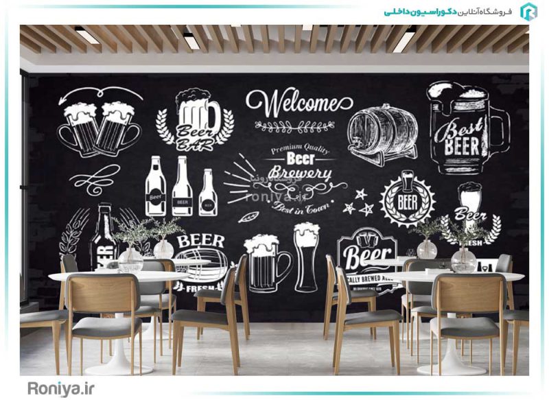 پوستر دیواری رستوران طرح نوشیدنی زمینه ای تیره رنگ دارد که باعث شده است رنگ سفید خودنمایی کند. ترکیب رنگ های این پوستر بسیار شیک است و به همین دلیل در دکوراسیون های داخلی مدرن با نورپردازی مناسب استفاده می شود.