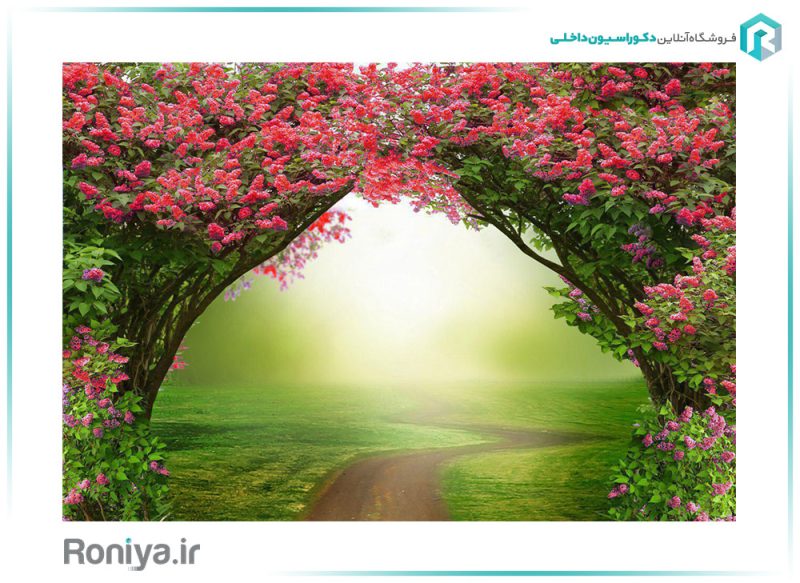 تصویرسازی مه در پایان جاده ی سرسبز پوشیده از چمن و طاقی از گل های قرمز و بنفش، آرامش بخشی بی بدیل است که طراوت را به فضای داخلی هدیه می کند.