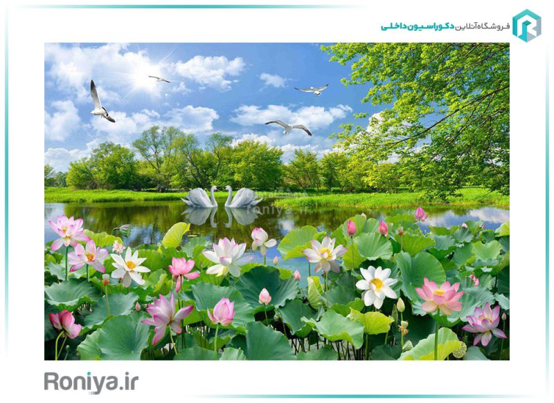 طرح برکه ای سرسبز با قوهای سفید را می توانید برای پاسیو، آشپزخانه، سرویس بهداشتی، بالکن یا ترس، حیاط خلوت و … استفاده کنید.