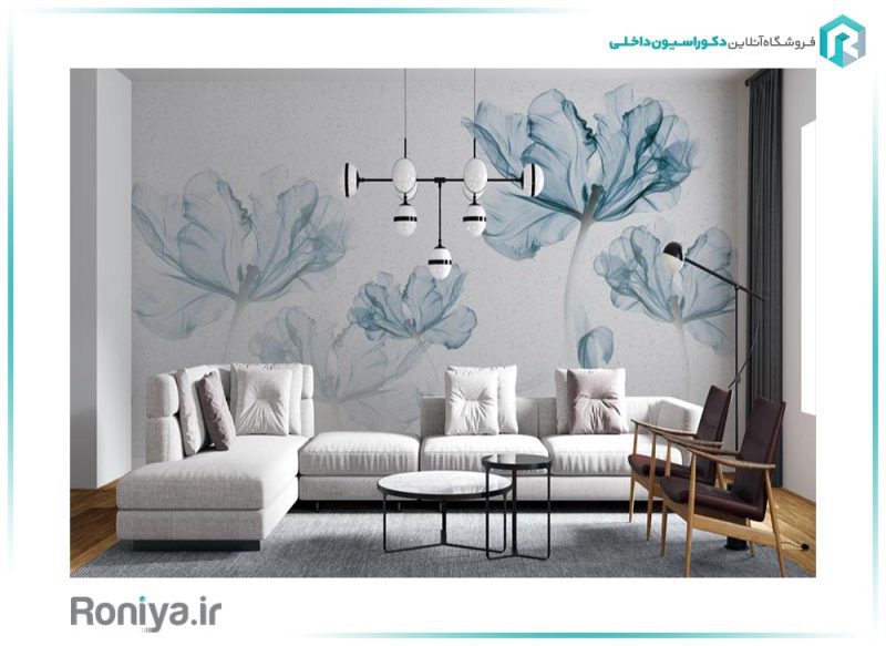 پیشنهاد می کنیم اگر می خواهید پذیرایی منزلتان زیبا و رویایی به نظر برسد از پوستر گل های آبی استفاده کنید، وجود رنگ آبی می تواند جلوه ی خاصی به خانه ی شما بدهد و همچنین باعث شود خانه ی شما بسیار شیک به نظر برسد.